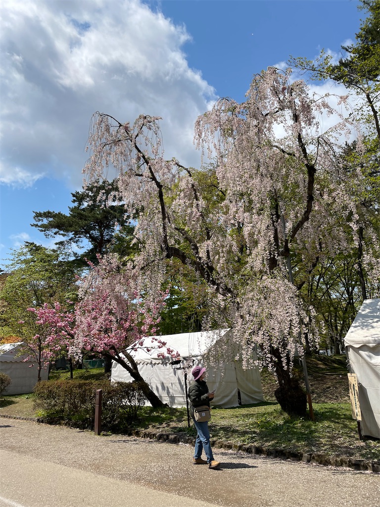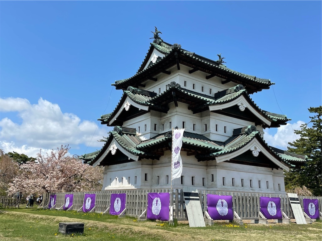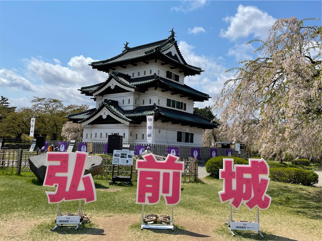観光館の目の前には弘前城の外濠が広がっています。弘前さくらまつりも終盤で、桜の花もだいぶ散ってしまいましたが、まだ咲いている桜もあるので期待。