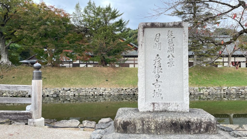 内堀に掛かる表門橋の近くには「彦根の古城」と刻まれた石碑が立っています。
