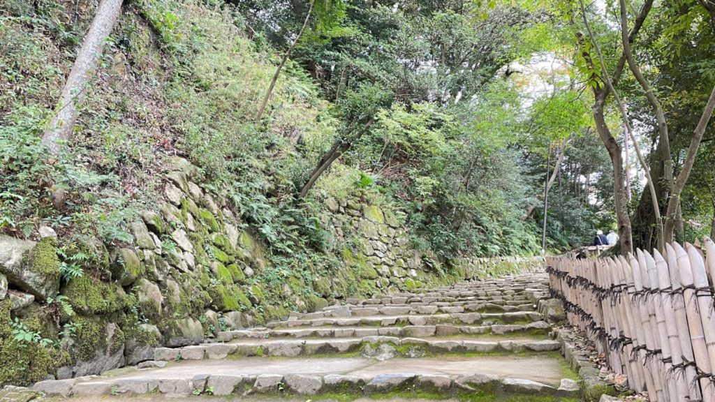 表門を入ってすぐ、長い上り坂の石段が表門山道です。左側は高い石垣になっています。
