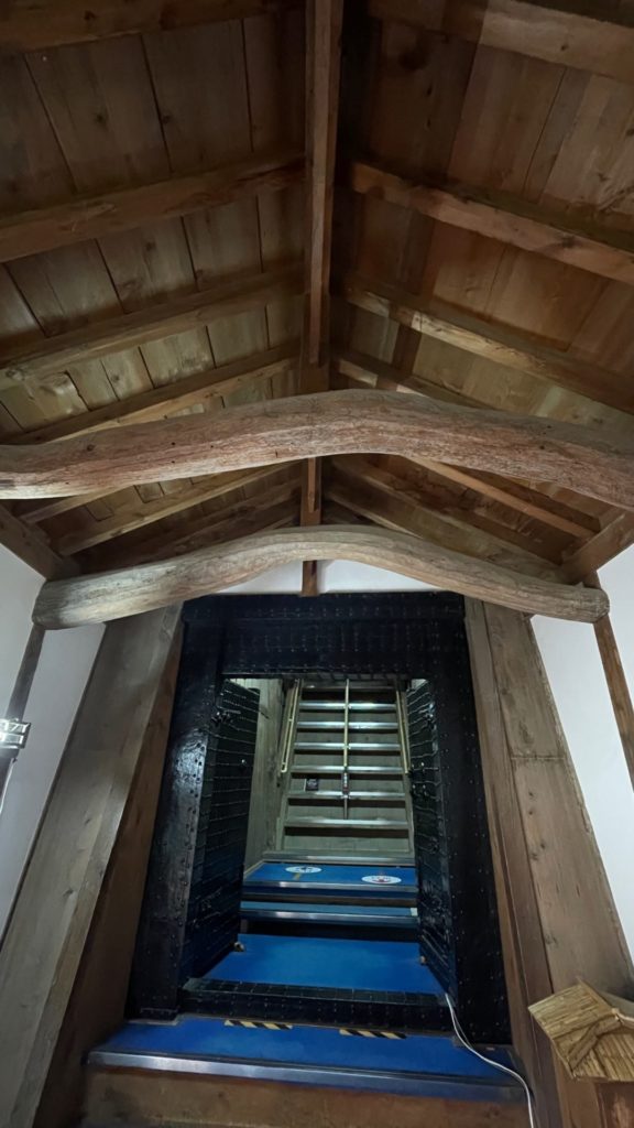 天守最上階の屋根の梁は、天然の木材を巧みに組み合わせて屋根を支えています。