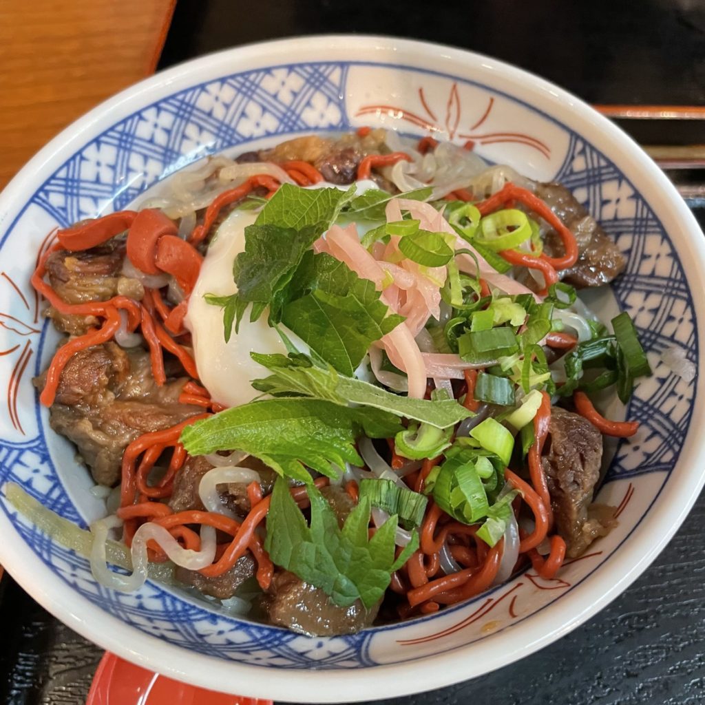 小谷城から宿泊先である彦根市のホテルに向かい、チェックインしました。今回は同じホテルに2泊しました。夕食は彦根駅前にある「八千代」というお食事処で「彦根丼」を食べました。近江牛と赤こんにゃくが入っていて、彦根ならではのメニュー。美味しくいただきました。