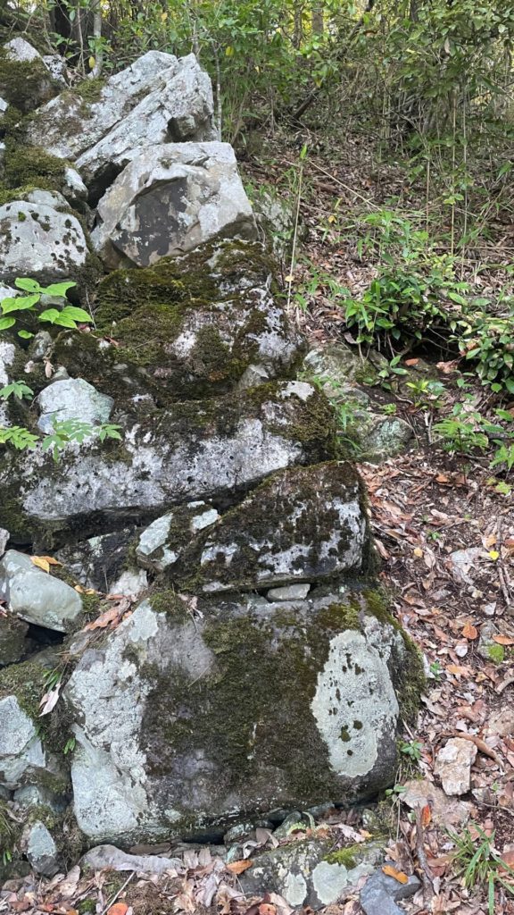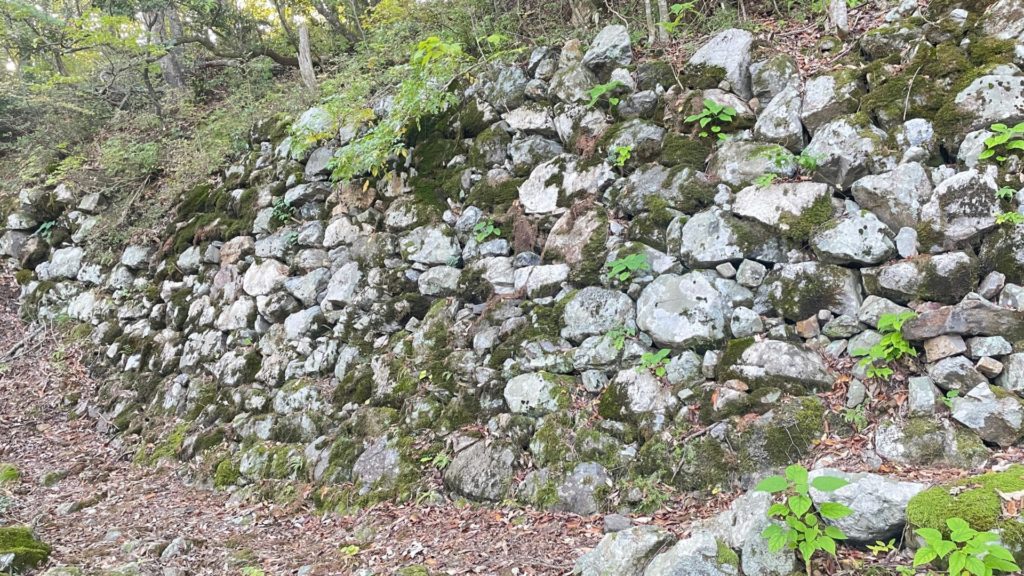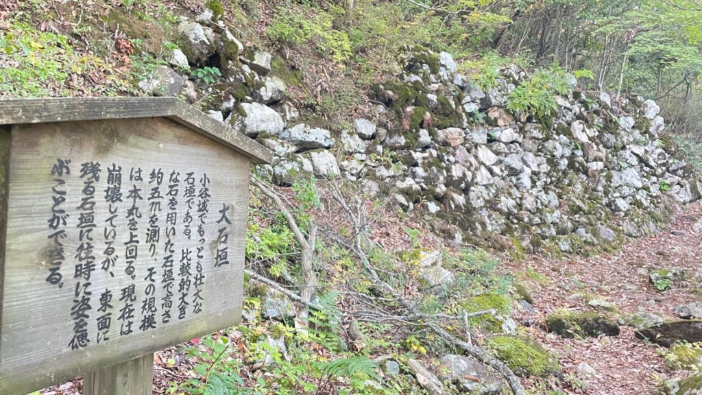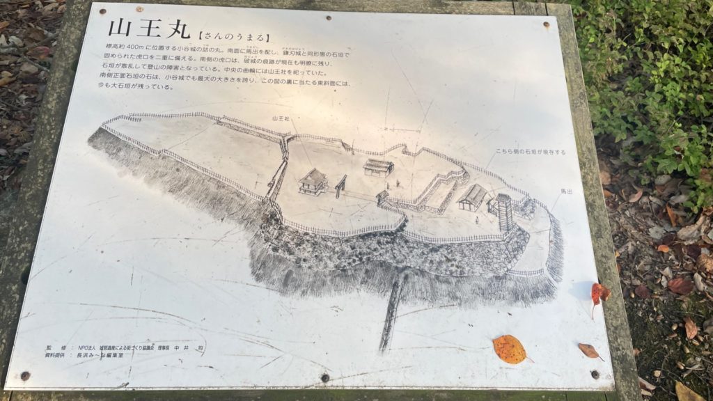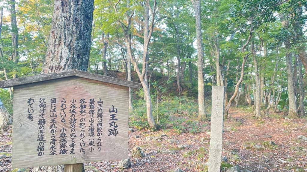小谷城の詰めの丸であった山王丸は標高400mに位置し、南側の石垣は崩落していますが、東側の「大石垣」が当時の痕跡を残しています。