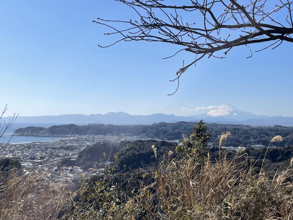 衣張山の山頂からの眺め。遠くに富士山や箱根の山々を望み、手前には相模湾が広がっています。鎌倉の街も一望できて、まさに絶景ポイントです。