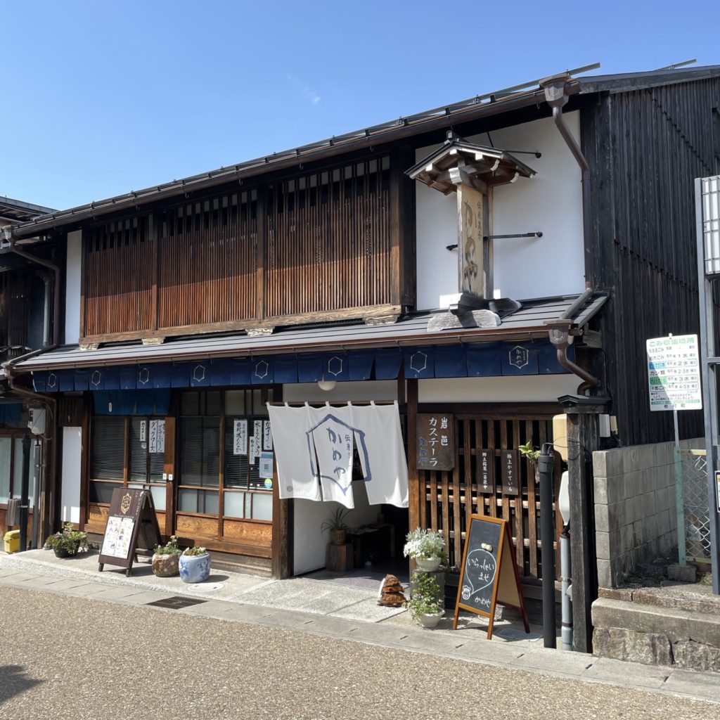 岩村の城下町にはカステラ屋さんが何件かあります。そのうちの1つ「かめや」でお土産にカステラを買いました。岩村のカステラは、江戸時代に長崎に勉強に行っていたお医者さんが伝えたことで現在も郷土菓子として作られ続けているそうです。ちなみに購入したのは「ゆずかすていら」と「和紅茶かすていら」。どちらも風味がよく美味しかったです。