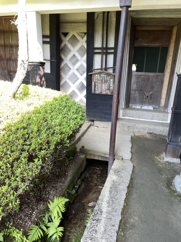 木村邱の敷地の中を流れる「天正疎水」。天正3年(1575年)に岩村に入城した川尻秀隆が城下町を形成するために作成した生活用水路で、今でも水が流れています。