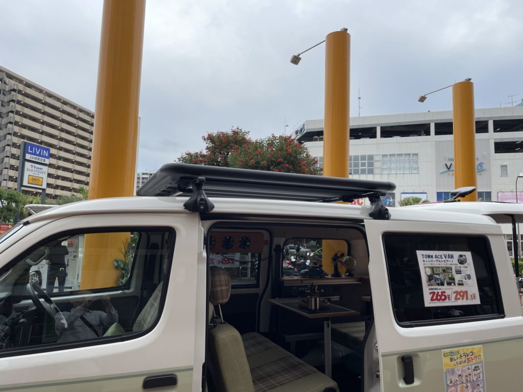 展示車の屋根に付いていたルーフキャリアに目が止まりました。アルトピアーノは車高が1,930mmあるので、ルーフキャリアを付けると高さが2.1mを超えてしまいそうで、どうしようかと考えていました。実は我が家はマンションで、駐車場が自走式の立体駐車場であるため、高さが2.1m以下に制限されています。また、よく利用するスーパーの駐車場も地下のため同じく高さ制限が2.1mになっています。