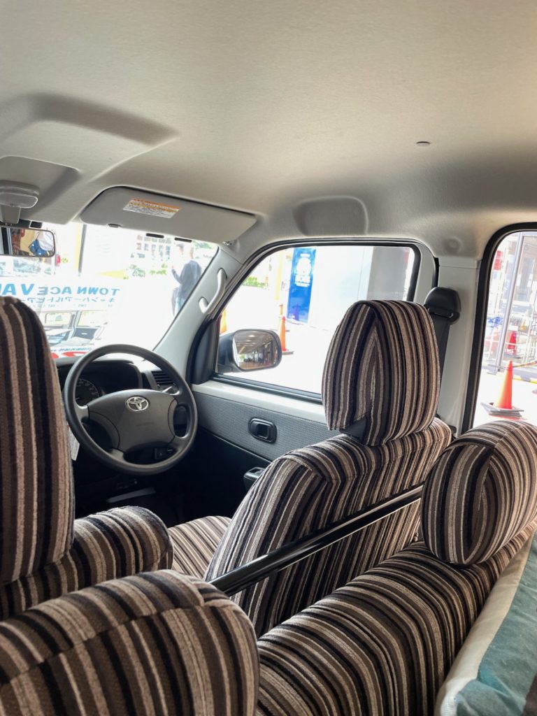 内装のシートカバーは標準ではストライプのシート生地ですが、我が家が注文した時には「60’s」というアメリカの60年代をイメージしたという特別仕様車があり、そちらのデザインが明るくて気に入ったので、そちらをチョイスしました。