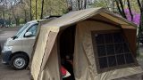 バックドアを開けたところ。後部の一番下、椅子兼ベッドになるボードの下は高さ25cmほどあり、ここにキャンプ道具やポータブル電源などを収納できそうです。ボードの上も荷物が載せられます。ボードの上にはコーナーテーブルが有り、停車中やベッド展開時には荷物や道具類を置くことができます。景色の良いところで、バックドアを開けて景色を眺めながらコーヒーを飲んだりしてみたいものです。