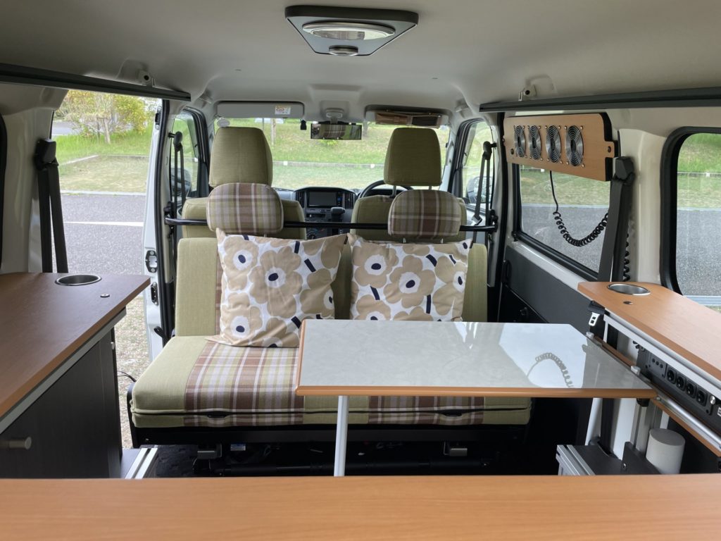 ライトキャンパーであるアルトピアーノの場合、ベースのタウンエースはハイエースと比べると小さくて中も狭いですが、軽バンコンと比べるとさすがに広く、大人2人であれば十分な広さがあります。特に軽で大人2人が過ごすとなると一般的にはお座敷モードでテーブルに向かう形になりますが、アルトピアーノであればダイネットモードで椅子に座ってテーブルを囲むことができます。